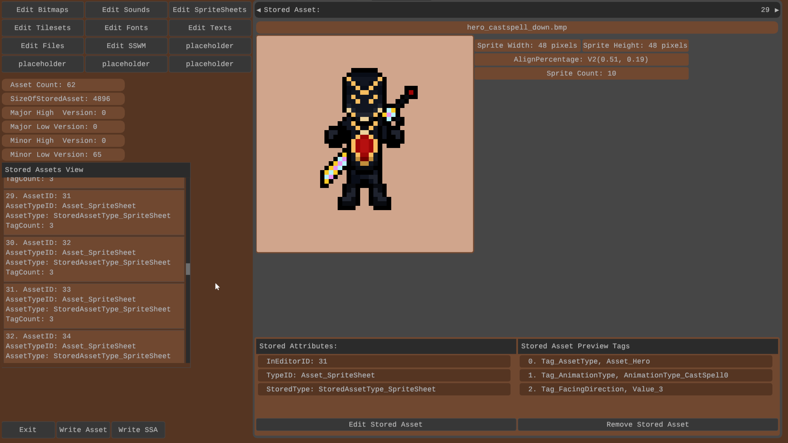 After completing my initial demo for my school capstone project, I set out to transform my work into a proper game engine, prioritizing ease of use and flexibility. My first focus was enhancing asset management and map editing. During the demo’s development, I built a basic tilemap editor that allowed me to place tiles, define collision boxes, and add static entities like trees, stones, and houses—represented as textures with collision data. It worked, but it lacked a user interface, undo/redo functionality, and advanced features like object manipulation or in-editor simulation with a player character. The output was three binary files—tile_map.bin, decorations.bin, and collisions.bin—containing tile textures, entity placements, and collision data. ...
